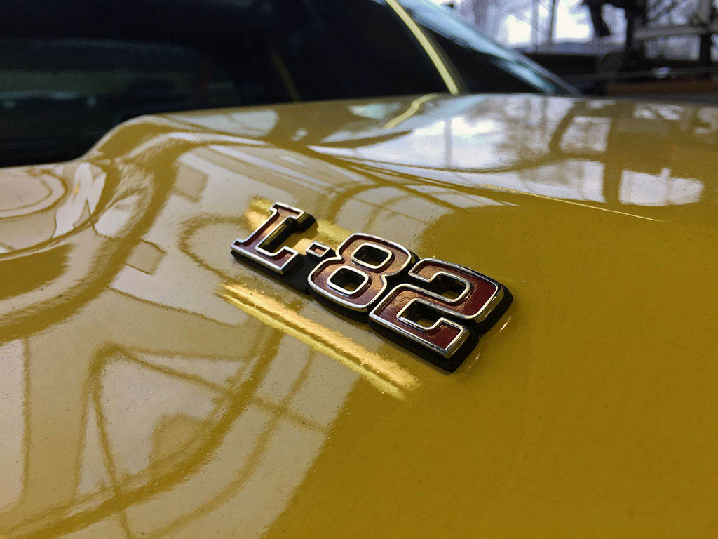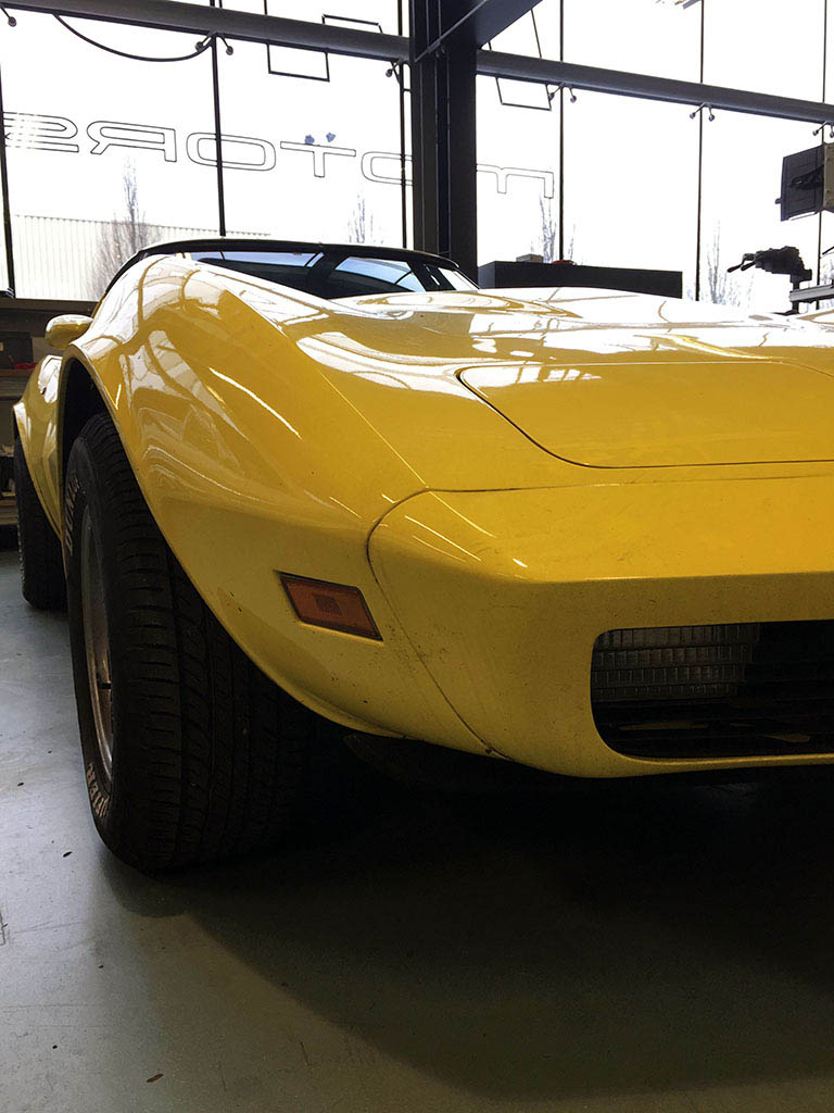 A bright yellow Corvette Stingray C3 arrived for service.